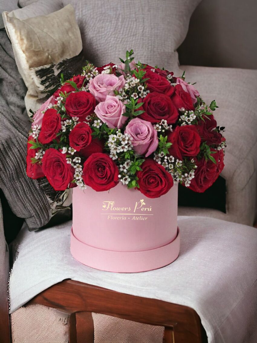 • Box Paty de rosas 50  rojas , rosadas y follaje importado
