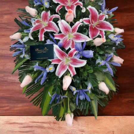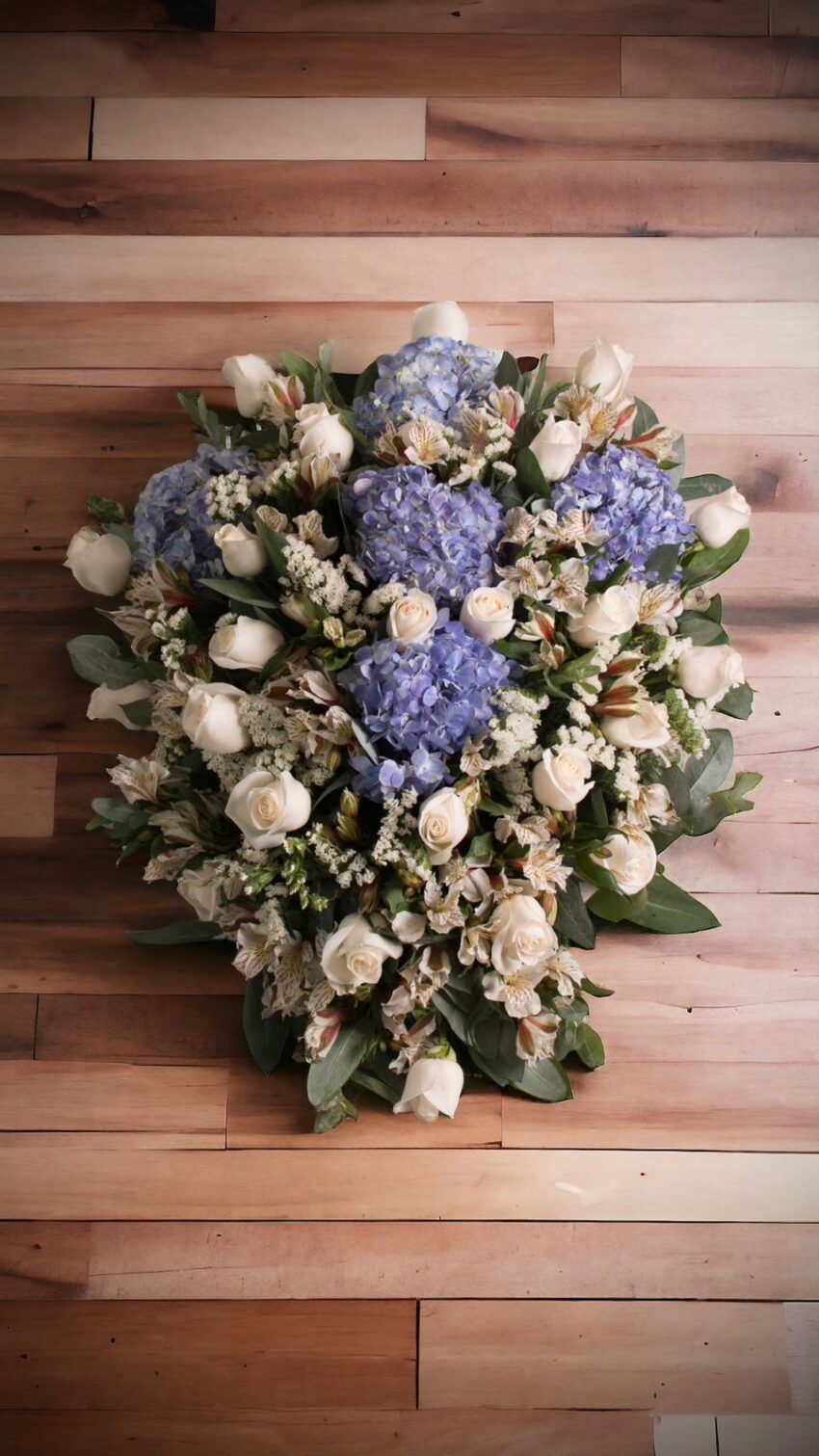 - LAGRIMA GRANDE GLADIOLOS , ROSAS BLANCAS , FOLLAJE VERDE ASTROMELIAS , ARAÑAS , HORTENCIAS AZULES