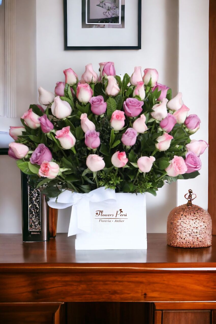 - Square Deluxe Luana de 48 rosas lila , blanco , rosado y mirto importado